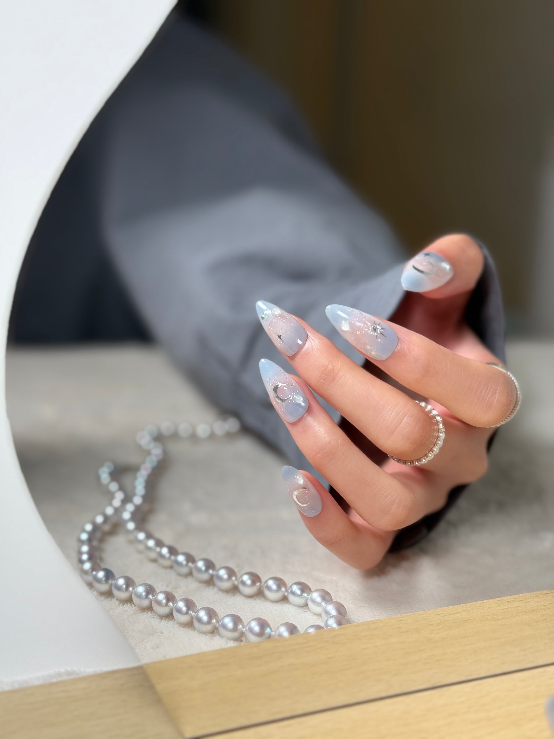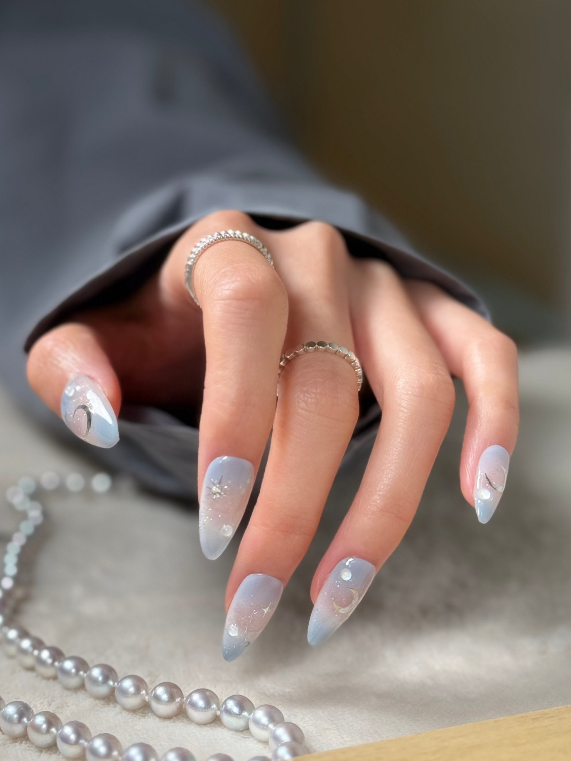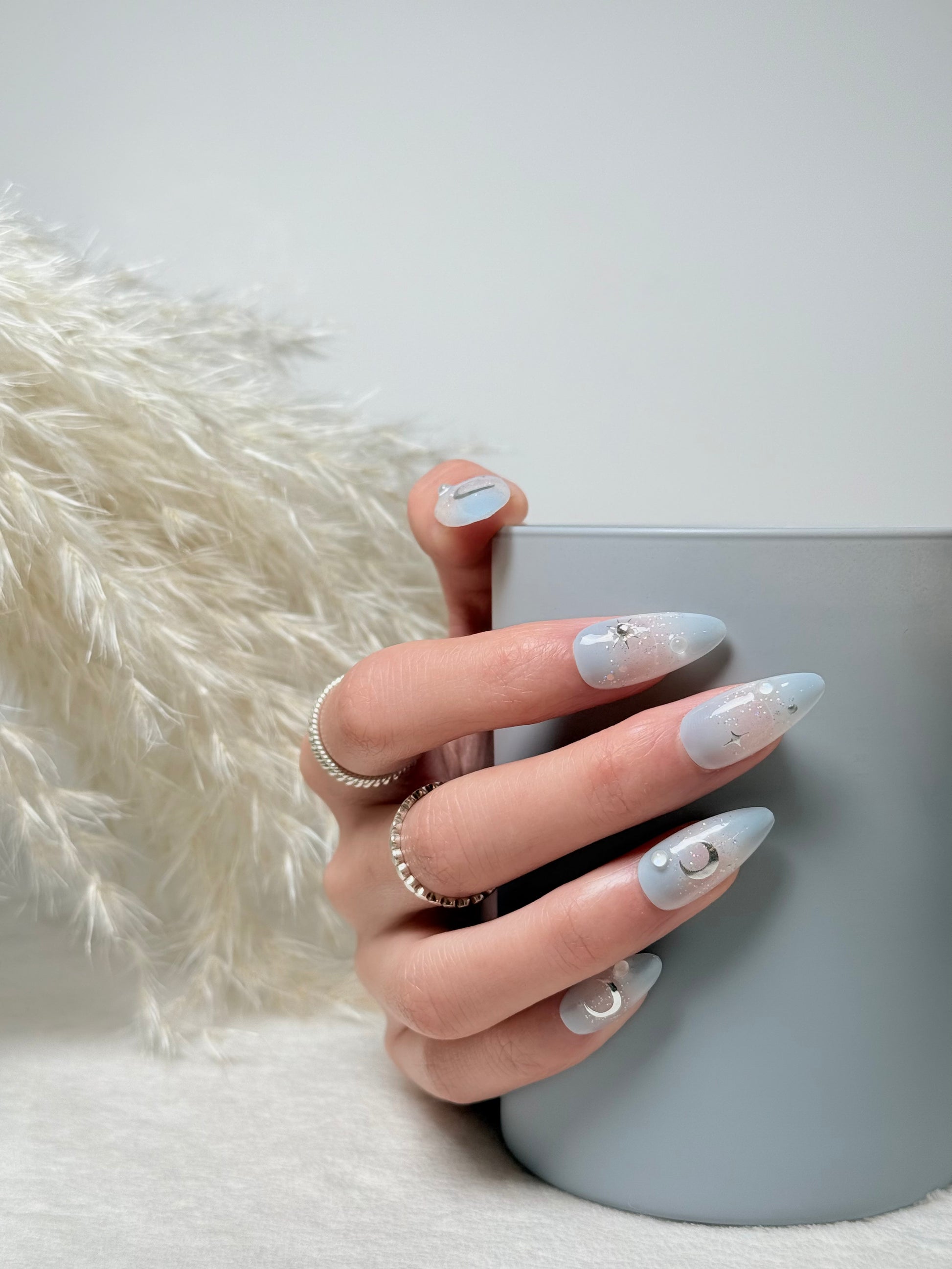 Soft translucent base with delicate celestial accents. This dreamy design showcases subtle silver details, crescent moons, and sparkling star embellishments, evoking the calm and beauty of a moonlit night.