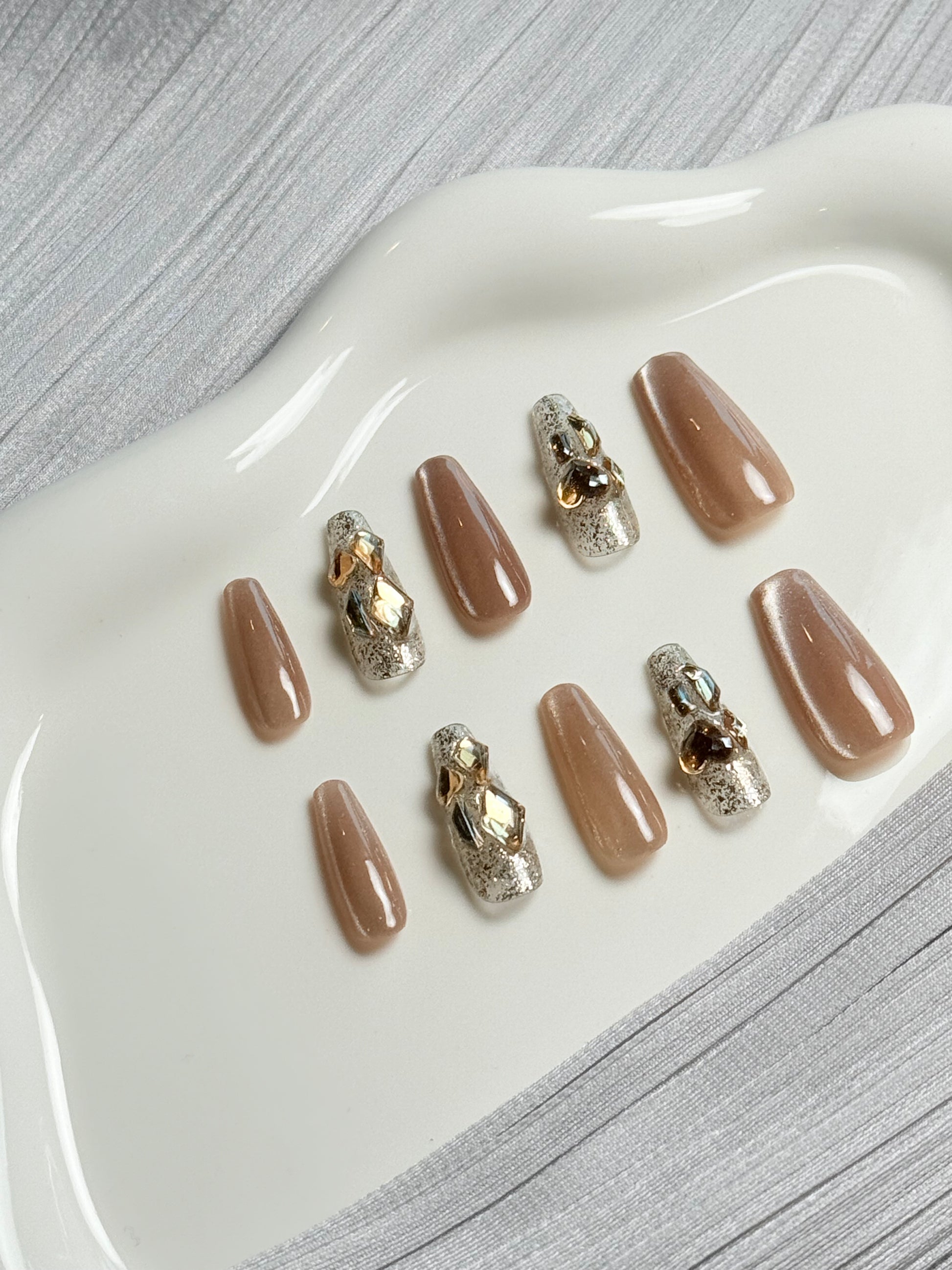 Velvety taupe meets molten gold and crushed metallics in Bronze Mirage—a statement set that balances earthy warmth with gilded opulence. The sculpted chrome jewels add depth and dimension, perfect for elevated evenings and unapologetic glamour.