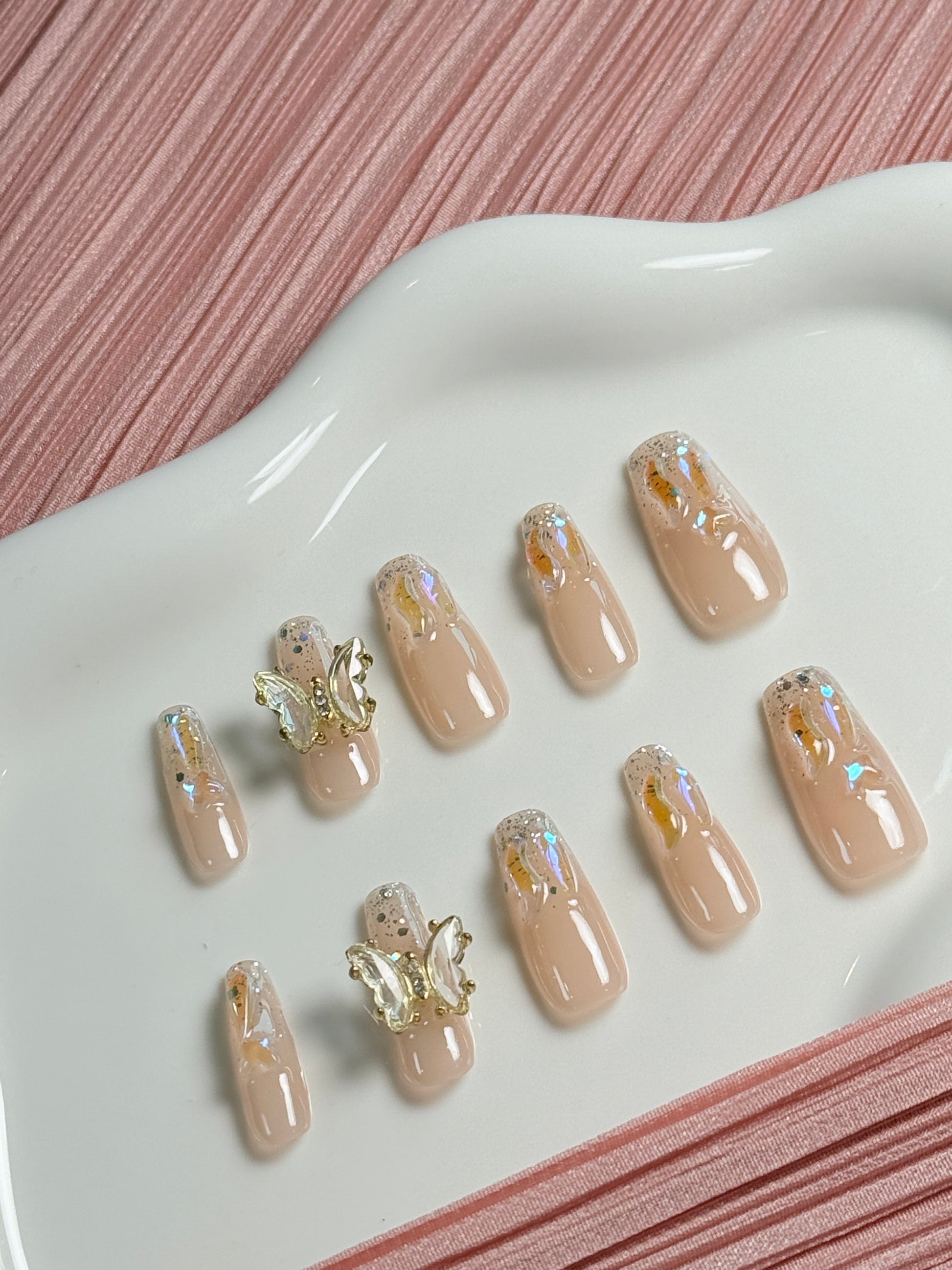 Nude Spark is all about understated elegance with a touch of shine. Featuring a soft nude base paired with mirror-finish chrome tips and dainty gem accents, this set brings modern minimalism to life. Perfect for everyday wear, bridal looks, or when you want your nails to whisper luxury.