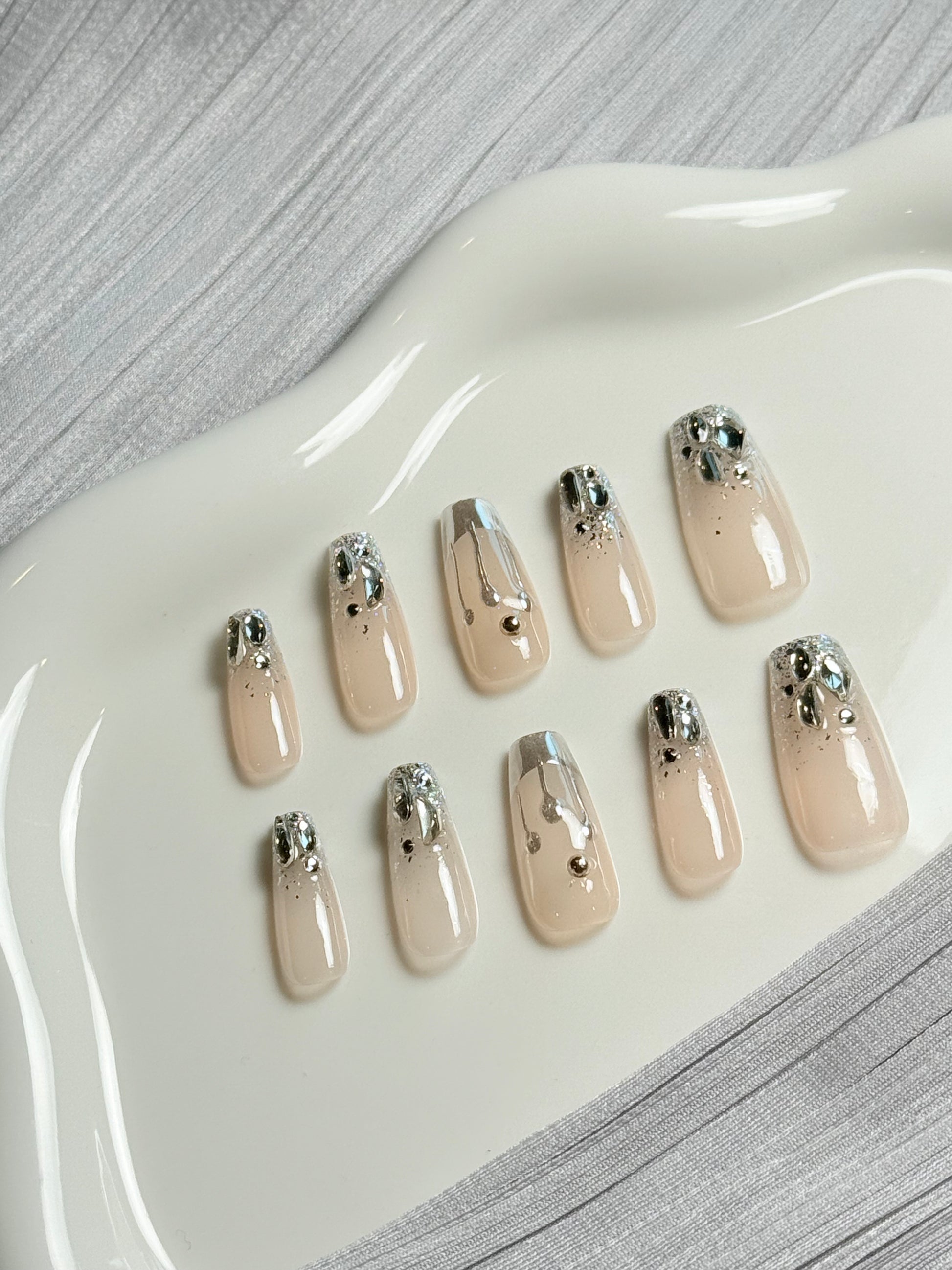 A nude base melts into molten chrome, creating a bold yet elegant contrast. Molten Silver drips with futuristic glam—featuring high-shine metal accents, liquid-like foil, and sculpted gems. Ideal for nights out, fashion-forward looks, or when you’re ready to shine without saying a word.