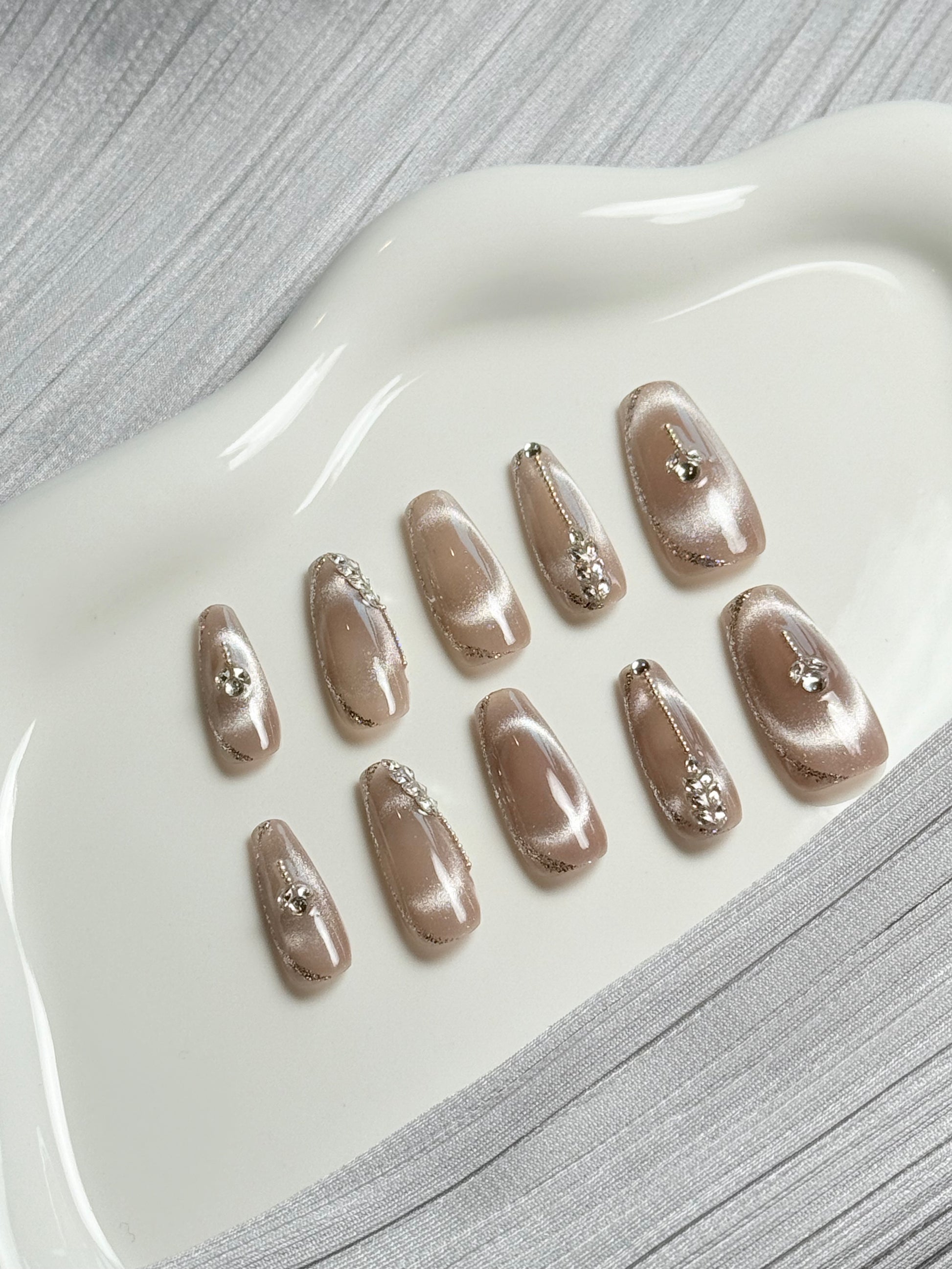 A silky taupe base infused with subtle shimmer and crowned with crystal accents—Moonlit Mink is where elegance meets evening glow. The perfect balance of soft metallic sheen and refined sparkle, this set is made for those who shine effortlessly.