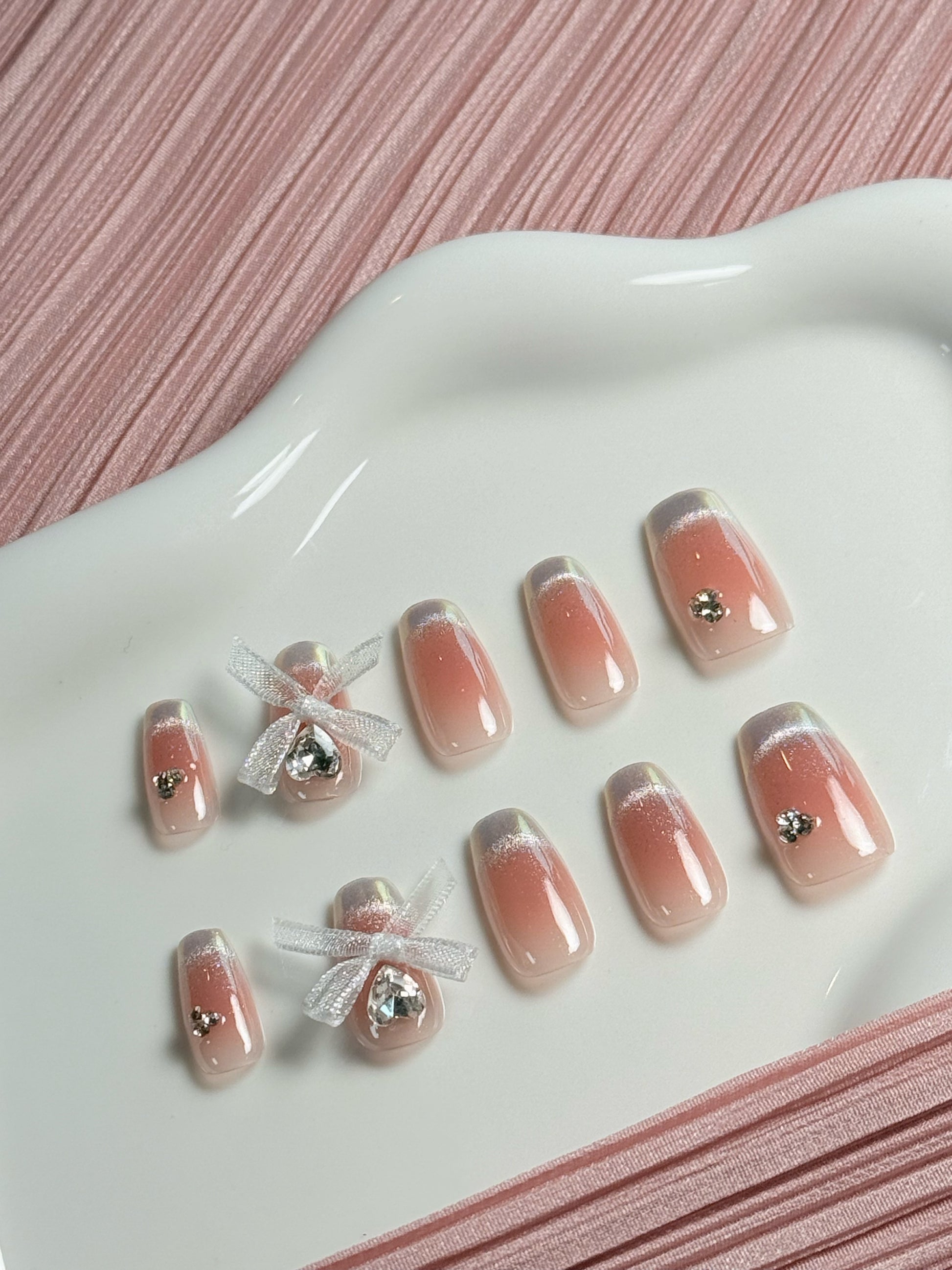 Rosé Ribbon is the perfect blend of romance and sparkle. This set features a dreamy peachy-rose ombré base with a subtle shimmer finish, accented with delicate rhinestones and finished off with statement 3D crystal bows wrapped in sheer ribbon. Feminine and playful, it’s perfect for date nights, special events, or anytime you want to feel extra adorable.