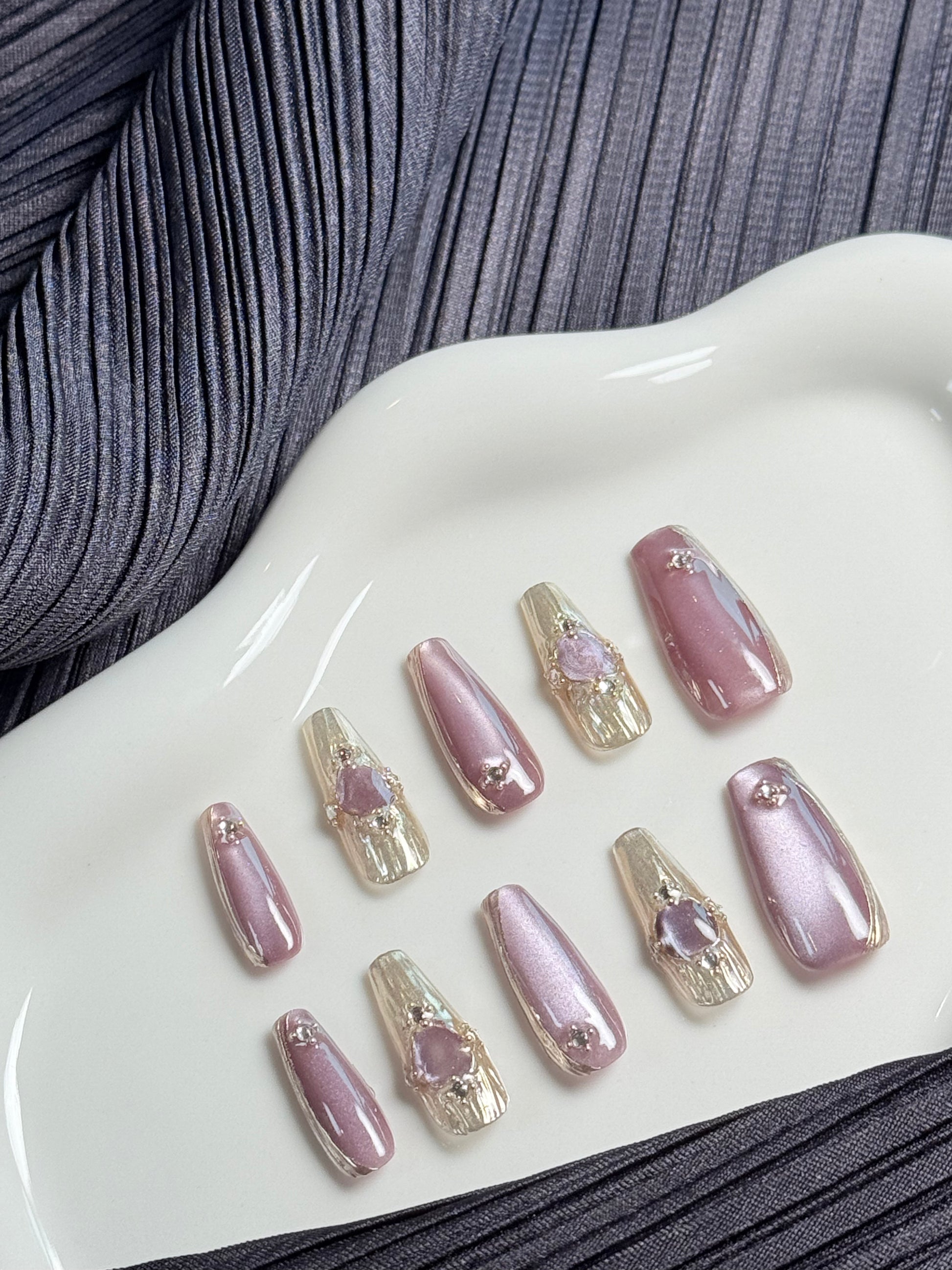 This design blends rich mauve tones with velvety metallic sheen, accented by textured gold foil and glimmering lavender stone embellishments. The perfect harmony of bold and graceful, this set is ideal for evening events, romantic nights, or anytime you want to channel quiet luxury.