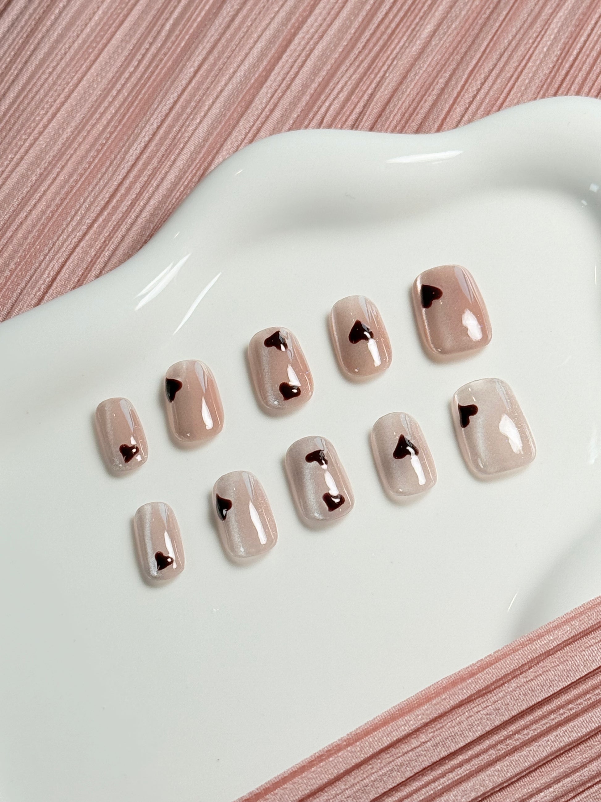 A nude-toned canvas adorned with dainty red hearts—Whispered Hearts speaks softly of love and elegance. This minimalist design is perfect for adding a subtle romantic flair to your everyday look, blending sweetness with quiet sophistication.